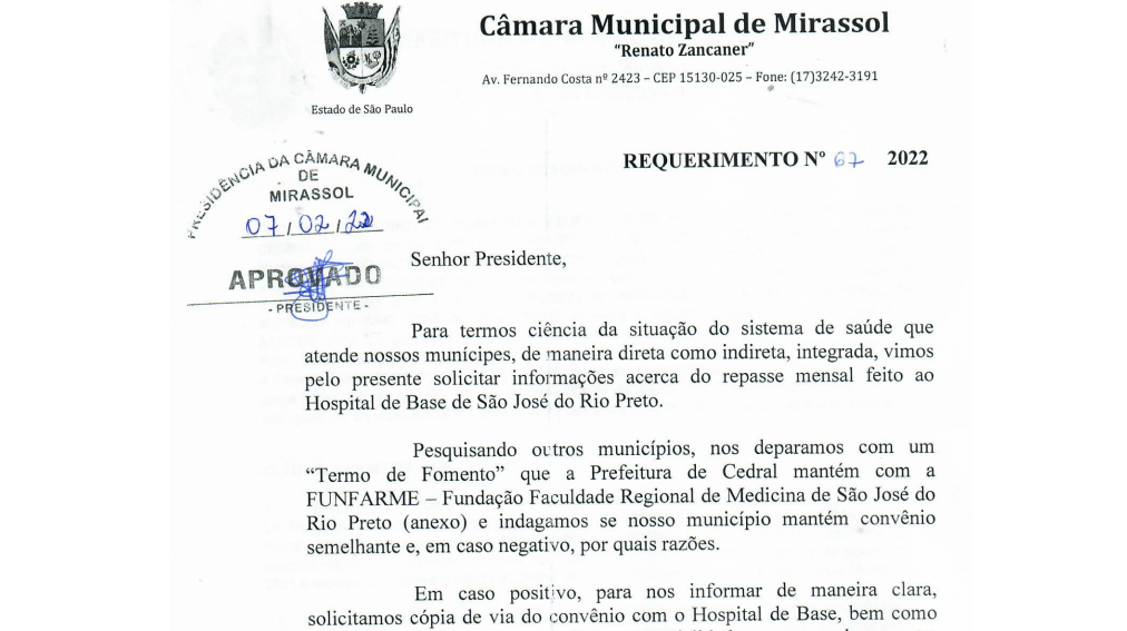 Ofício questiona providências para evitar possível bloqueio de aten...Um ofício especial enviado pela Câmara Municipal à Prefeitura de Mirassol pede orientações sobre os atendimentos dos munícipes no Hospital de Base. A preocupação é que alguns serviços sejam interrompidos a pacientes encaminha...