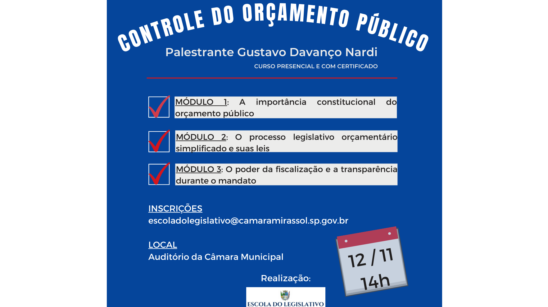 "Controle do Orçamento Público" marca início da Escola Legislativo...A realização do curso “Controle do Orçamento Público”, na última sexta-feira (12), marcou o início do programa Escola do Legislativo de Mirassol. Três importantes temas foram abordados na primeira atividade, que foi presencial...