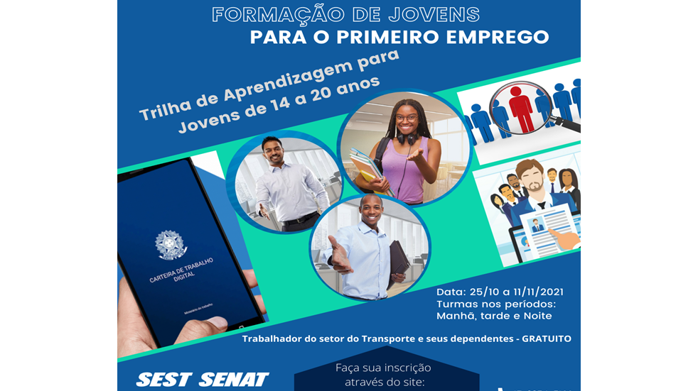 Sest-Senat está com capacitações para preparar jovem ao mercado de...O Serviço Social do Transporte-Serviço Nacional de Aprendizagem do Transporte (Sest-Senat) está com inscrições abertas para o curso de “Formação de Jovens para o Primeiro Emprego”. A trilha de aprendizagem abordará 10 temas de...
