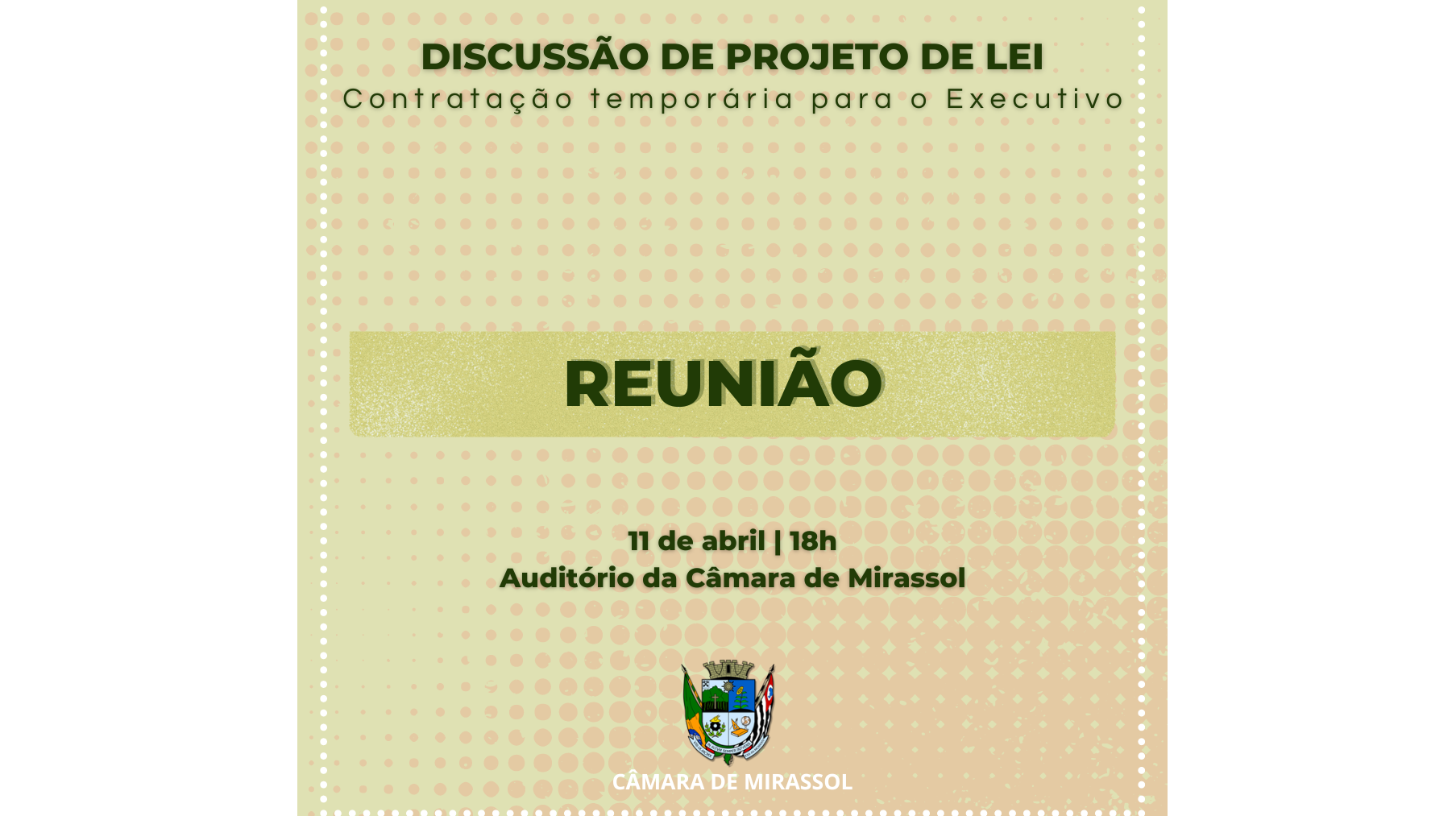 Câmara discute PL sobre contratação de profissionais para situações...A Câmara de Mirassol realiza nesta terça-feira (11), às 18h, uma reunião para discutir um projeto de lei do Executivo sobre a contratação temporária.O objetivo do PL é atender necessidades excepcionais da cidade em áreas, como...