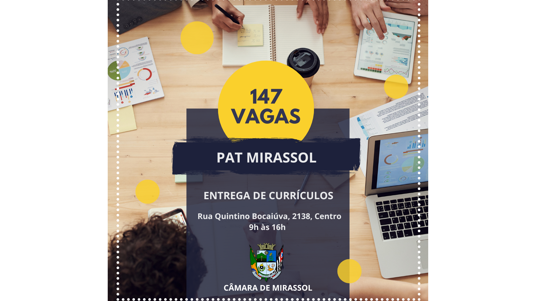 Confira as 147 vagas de emprego no PAT MirassolTemos novas oportunidades de trabalho! Agora são 147 vagas oferecidas pelo Posto de Atendimento ao Trabalhador de Mirassol. E uma pode ser sua!Os interessados devem comparecer pessoalmente no PAT Mirassol com currículo, carteir...