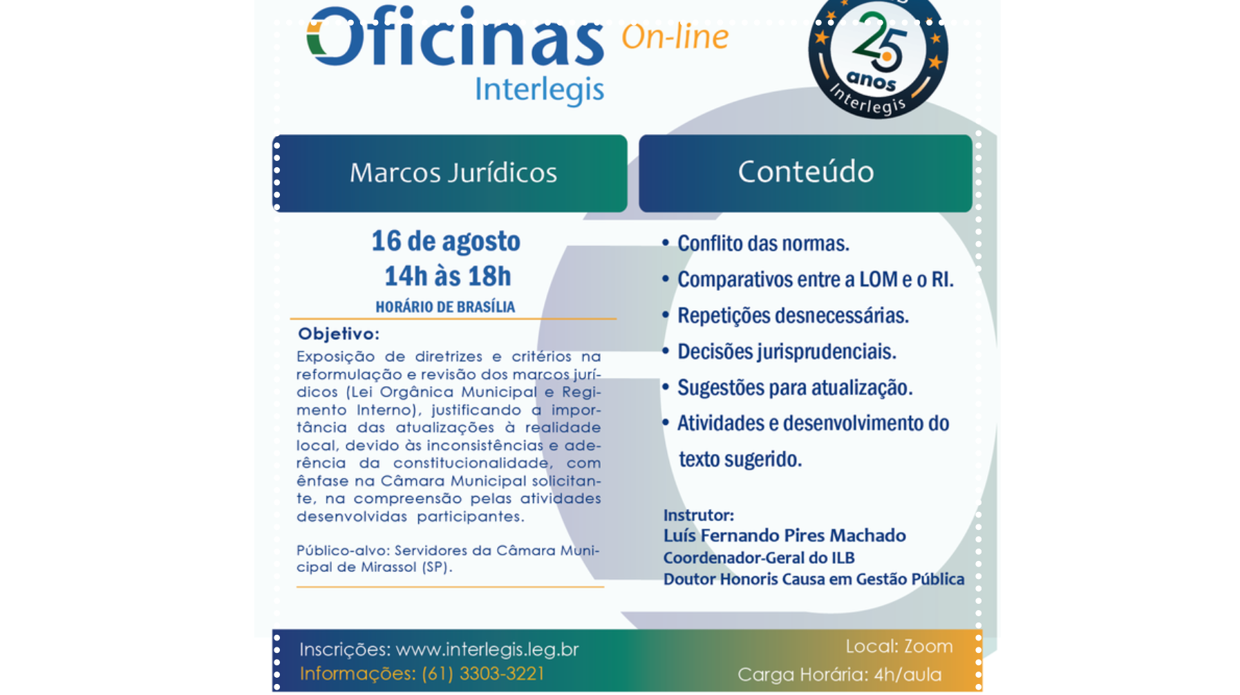 Servidores participarão de oficina virtual sobre Marcos JurídicosServidores da Câmara de Mirassol vão passar, no próximo dia 16, por um treinamento sobre as principais revisões dos marcos jurídicos municipais. O objetivo é oferecer suporte técnico para futuras reformulações nas normas locais...
